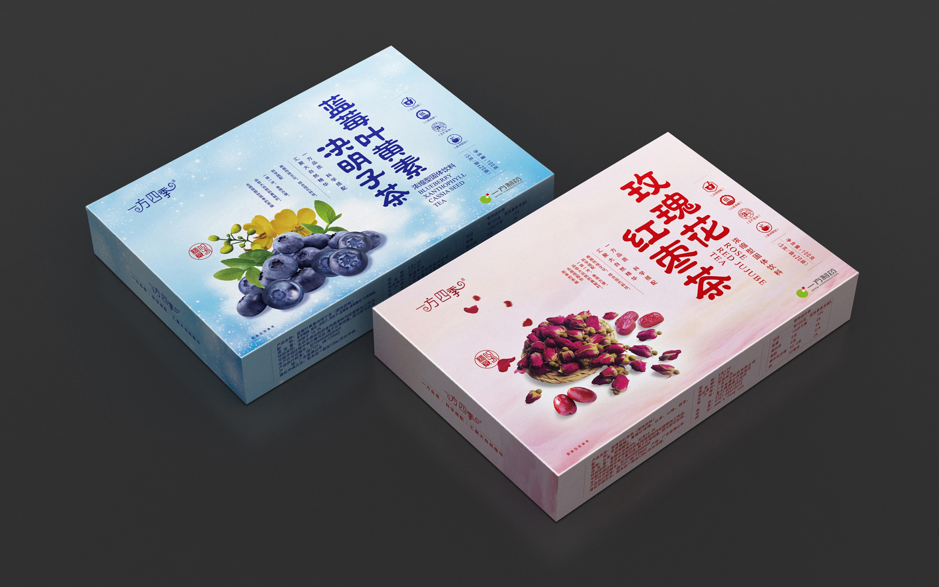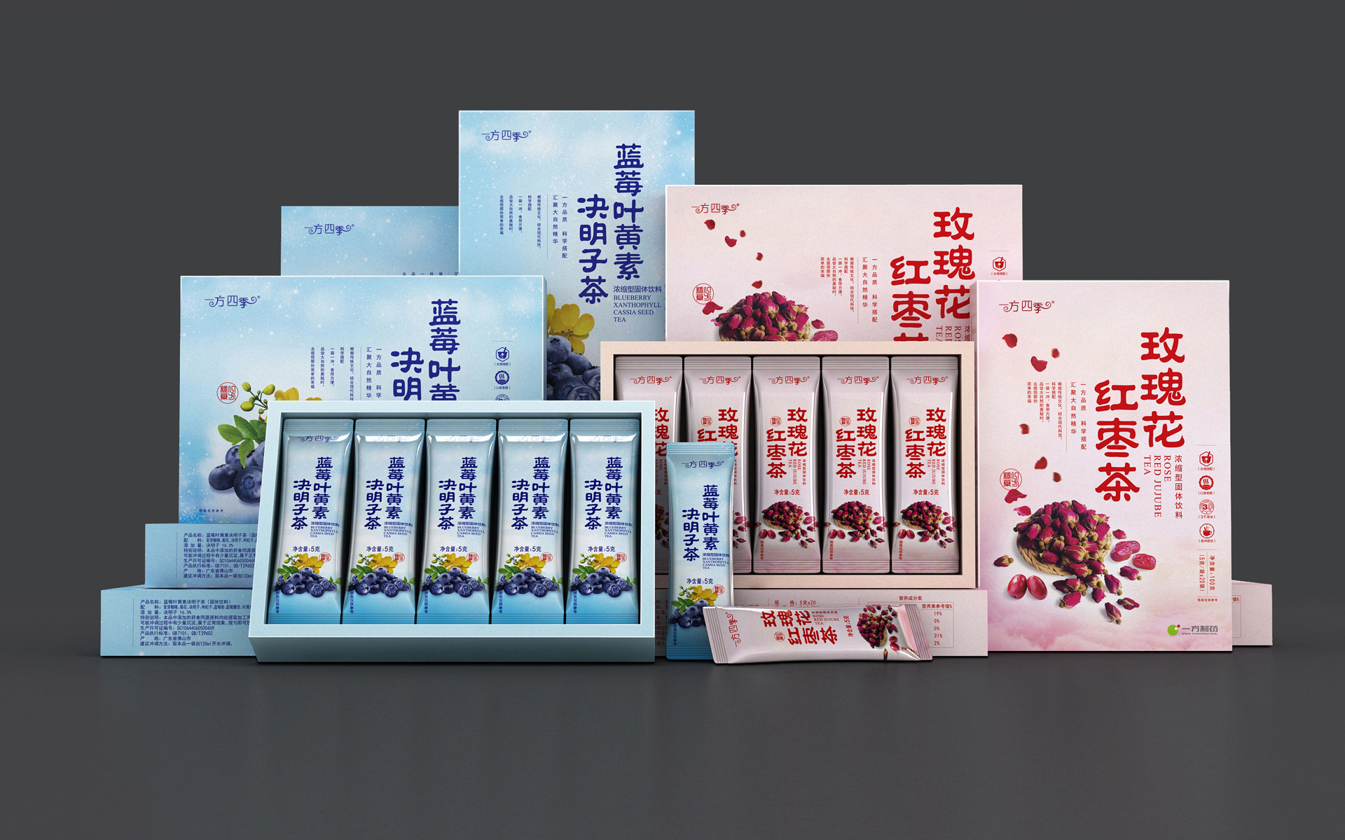 成功的水果茶包装设计不应该以替设计公司获奖为目的,称职的专业包装设计公司应该是为客户品牌的成功销售为设计方向。一方制药花茶包装设计是亘一上海包装设计公司专业团队打造,我们用最简便的包装盒结构,以平实朴素的艺术手法表现塑造水果茶包装设计的外在形象,旨在传达“国药品质 药食同源”的品牌信赖感。通过花茶包装设计的优雅真实感,打消顾客购买时习惯产生的疑虑。一方制药本系列功能饮料包装设计的内容物为浓缩型固体饮料,是博士团队精心研发设计的健康时尚饮品,玫瑰花红枣茶针对女性健康饮品需求设计,安神养颜;蓝莓叶黄素决明子茶具有明眸善睐的养生功效。两款花茶产品包装设计风格统一,在销售终端展示效果非常突出,深受消费者喜爱。