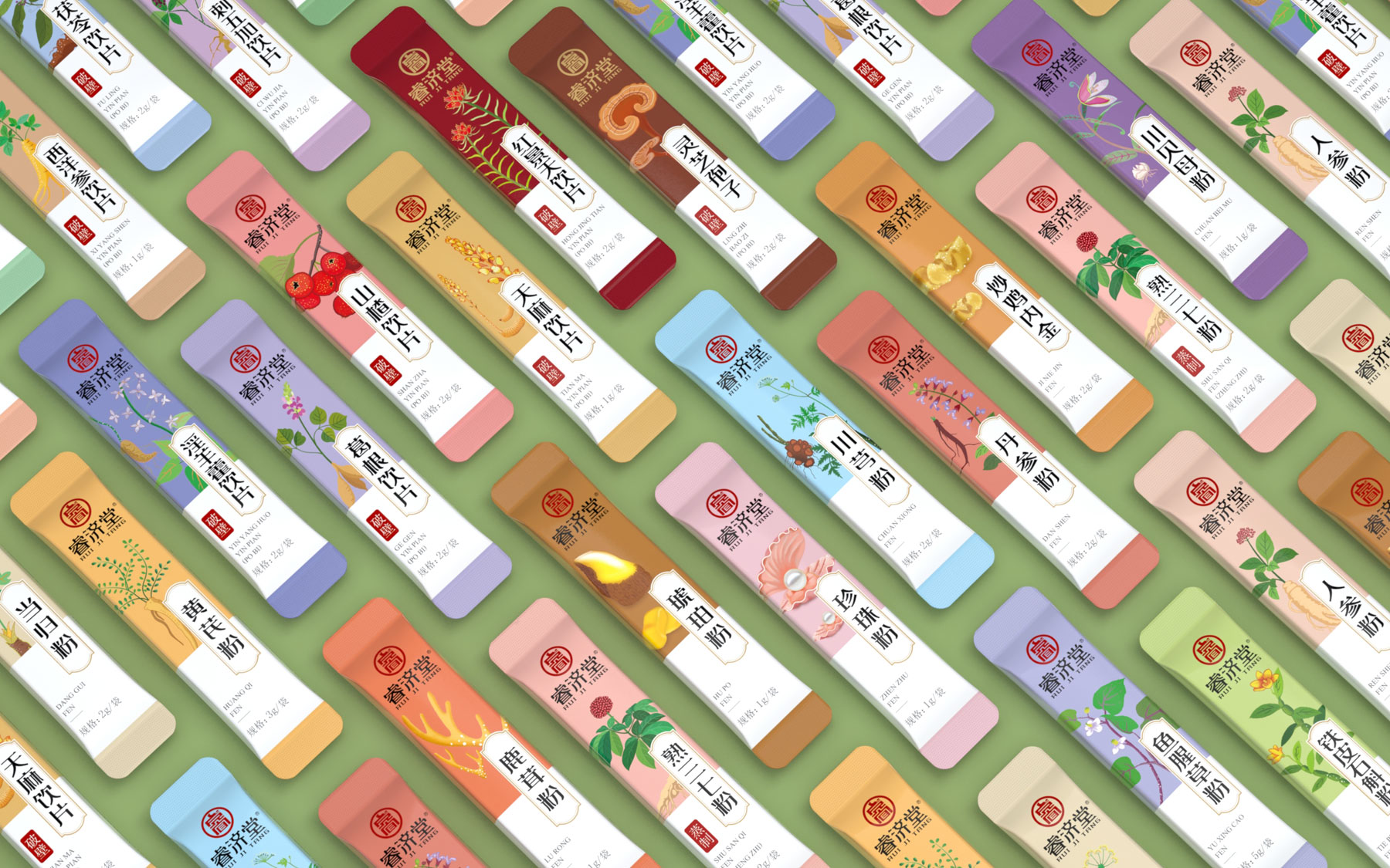 破壁超微粉系列中药包装设计共计二十六款单品,产品矩阵大品种多,