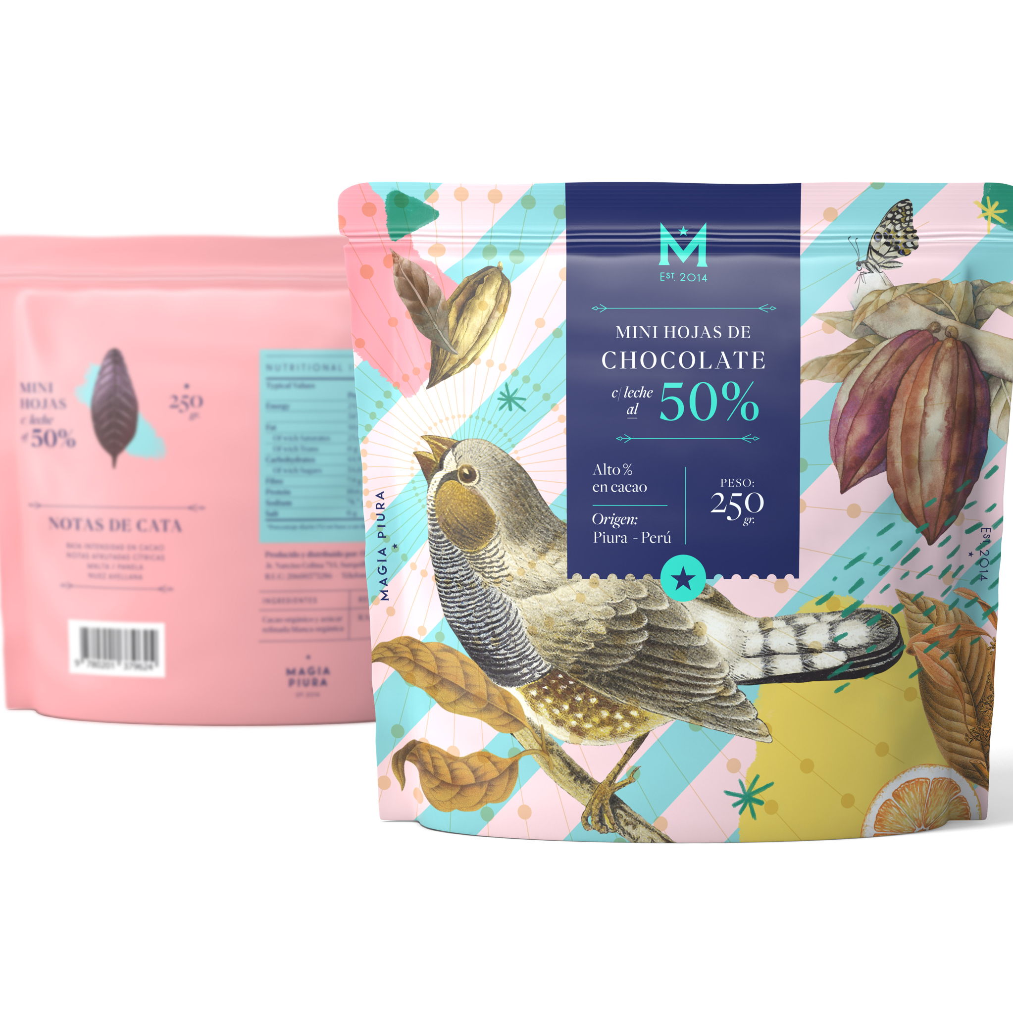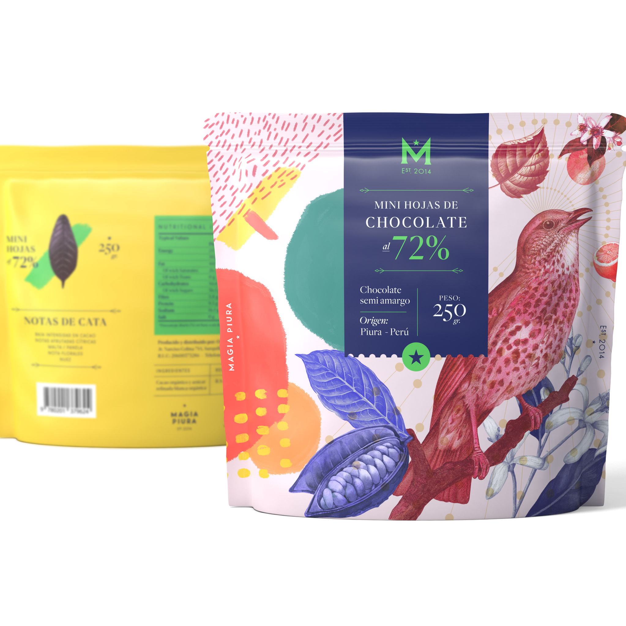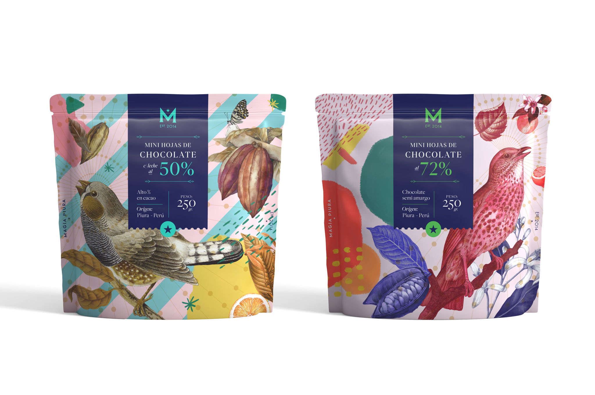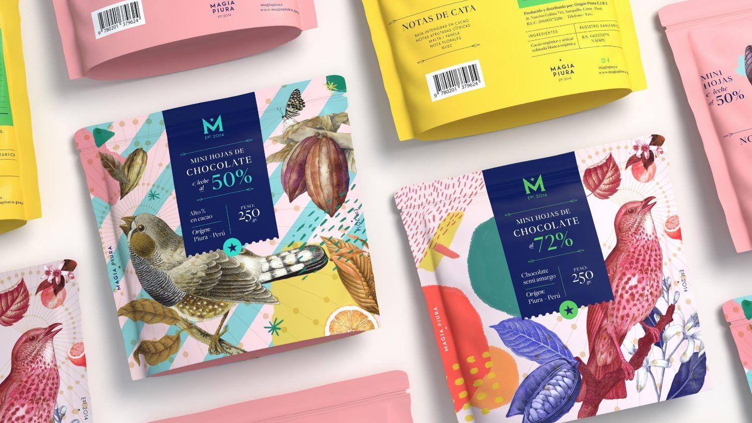 Magia Piura的巧克力包装设计由亘一上海食品包装设计公司推荐,产品包装设计通过图案和抽象设计,通过鸟类、植物和艺术展现自然。创造出独一无二包装。