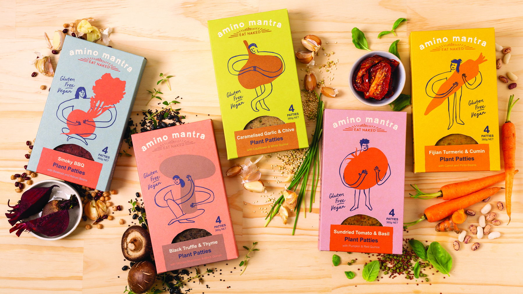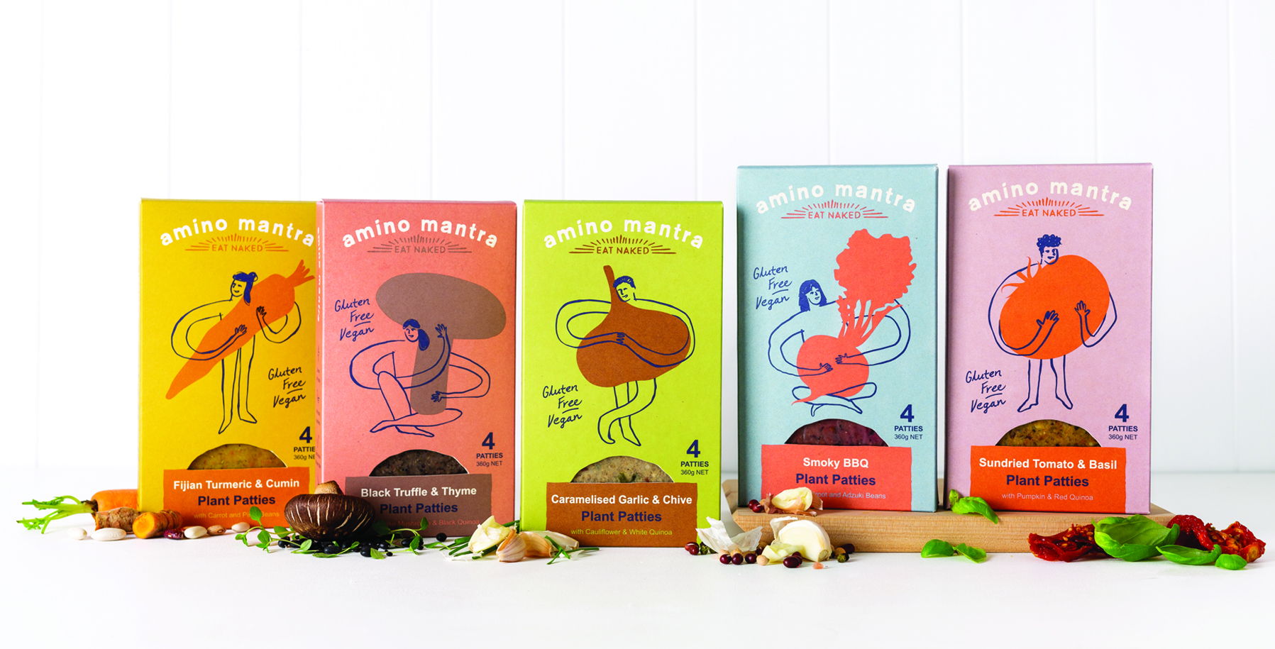 正常的电脑设计过程在项目开始时就被放弃了,回到铅笔和纸张的'直观'方法。这使我们能够自由地创造出具有自发性和诚实感的排版和插图。通过这个探索之后,植物与人之间的共生关系的概念也得到了发展,然后我们通过将每个产品变体的幼稚线条图与主要蔬菜相互作用进行视觉捕捉。这是Amino Mantra所代表的一切的简单类比。这种精致而又令人回味的图像在包装上突出显示,并与精美的色调同步。