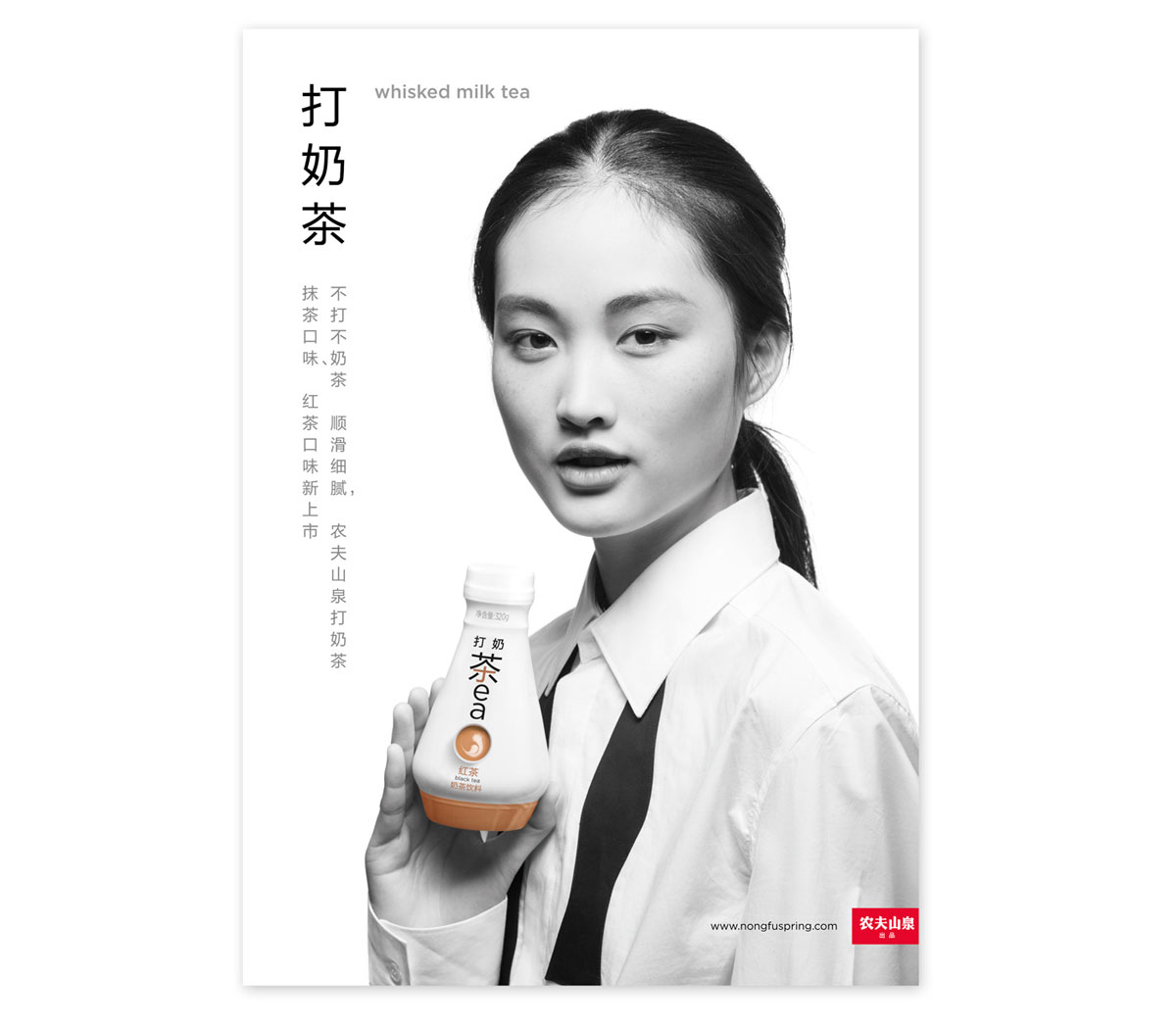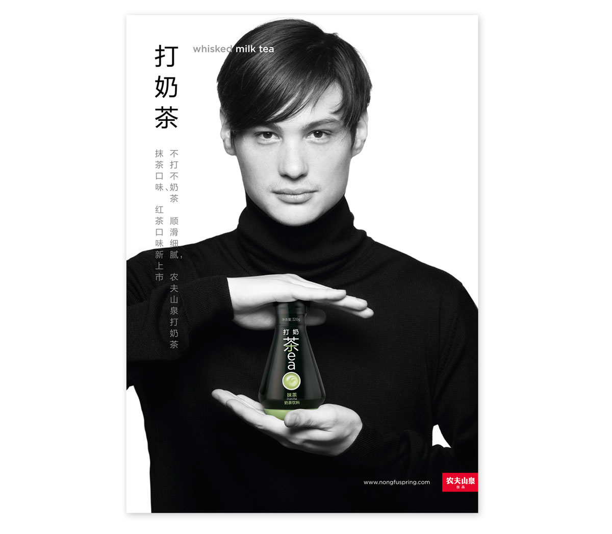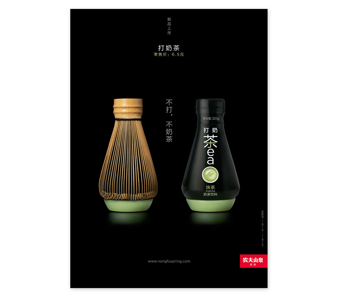 受委托的包装设计公司思路:我们的客户农夫公司是中国最大,最知名,最受尊敬的公司之一,主要生产瓶装水。强大的品牌形象和公司的声誉(天然泉源,传统价值观,对环境的尊重)要求我们对特定市场的细节进行非常彻底的研究。这两种茶饮料(抹茶奶茶和红茶拿铁咖啡都是通过使用特定的竹子工具进行最好的准备。我们在两个会聚轴上工作:我们将这种必不可少的搅拌工具的形状结合到瓶子的工业设计中,产生了完全独特而又自然的新包装形式;对于排版,我们使用形状/字母T作为链接将东方(中国)和西方(英语)单词结合起来。企业价值既向我们解释并在实地考察期间进行了研究我们通过实现的产品标识出现了。整个设计项目也证明了它也是一种文化延伸,这是我们非常享受并从中学到的一种探索。